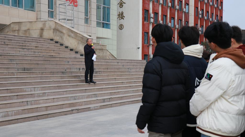 演练结束后,杨子峰对此次演练作总结发言。他结合近期社会上的重大火灾惨痛案例,深刻剖析了火灾的巨大危害,提出冬季是火灾的高发期,提醒同学在校期间要遵守学校的规定,在宿舍内不抽烟、不使用违规物品,手机充电器及时拔掉等。同时提醒同学们务必在未来的施工实践、设施使用中防患于未然,不断提升应急能力。他要求全体师生必须高度重视消防安全,真正掌握在危急情况下的逃生自救技能,将“安全第一,预防为主”的理念内化于心、外化于行。