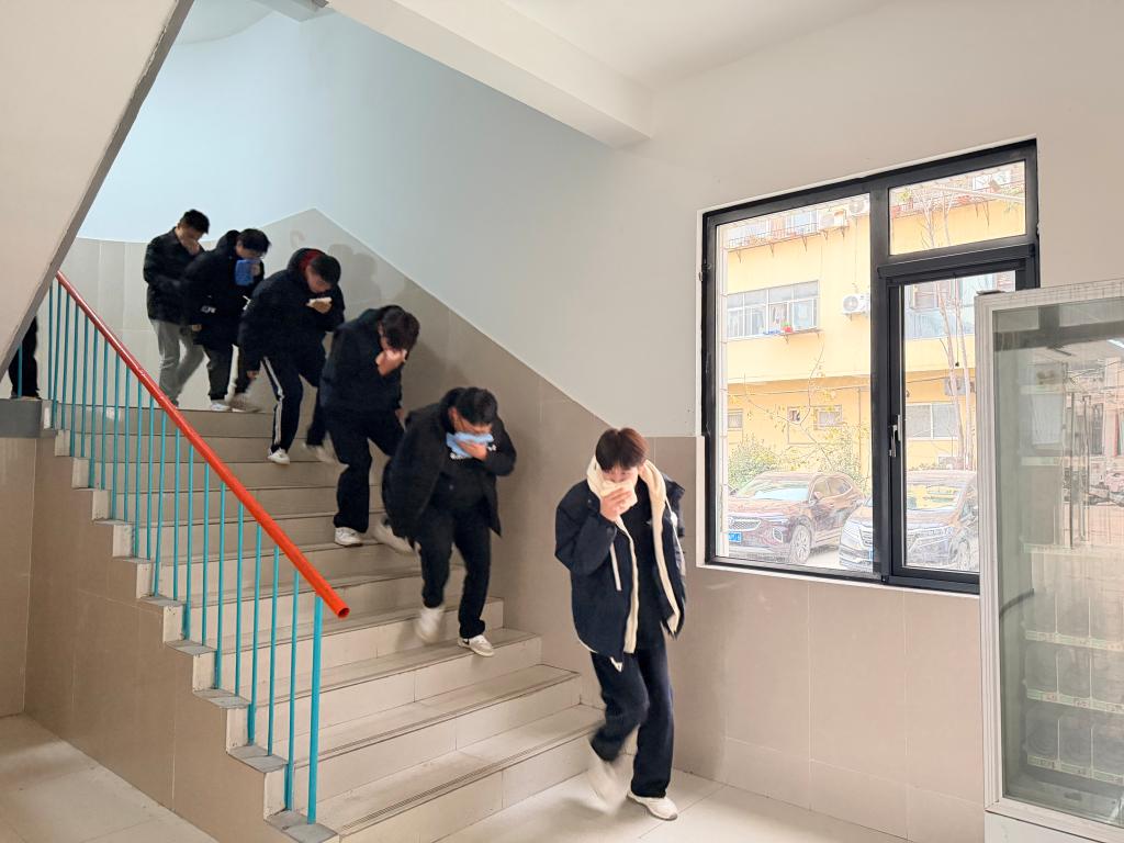 随着一声哨响,宿舍内学生低头弯腰,用湿毛巾掩住口鼻,弯腰低姿迅速有序下楼,然后快速到实训广场集合。