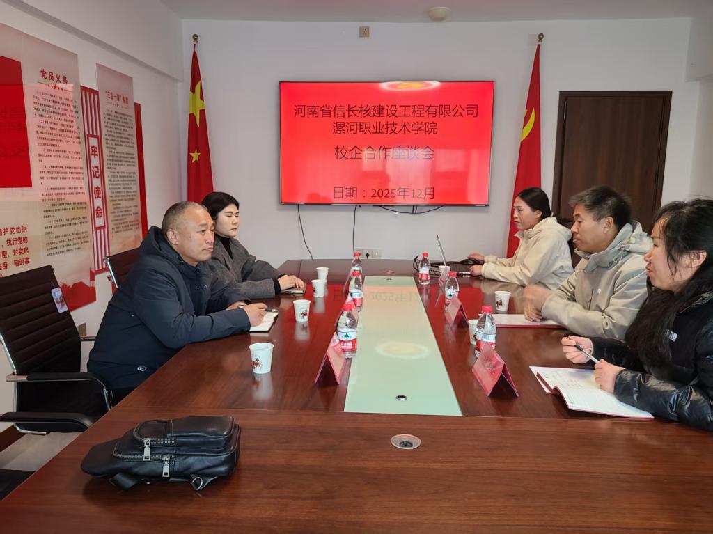 在洽谈交流中,信长核建设工程有限公司负责人详细介绍了公司的业务范围、培养理念及未来发展规划。公司位于中国防腐之都-长垣,主营业务涵盖核电工程、工业设备安装及特种作业工程等,和中核五公司、中核二三公司、东方希望集团等国企保持良好的长期战略合作关系,在核电、民用市场拥有良好的口碑,并与省内多所高校建立了校企合作关系。双方围绕人才培养需求进行了深入探讨,并在学徒制培养、项目实习以及潜在就业岗位提供等方面达成了初步合作意向。
