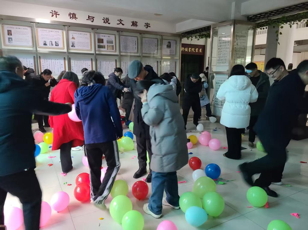 本次活动丰富多彩、别开生面,设有踩气球、你划我猜、蒙眼吃香蕉、筷子纸杯接力等多个趣味项目。虽然冬日的天气阵阵寒意,但是三号楼大厅内却一片热气腾腾,吸引了大批学生驻足观看,师生们欢声笑语,脸上都洋溢着迎接节日的欢笑。